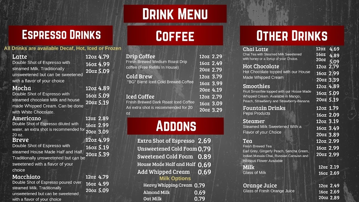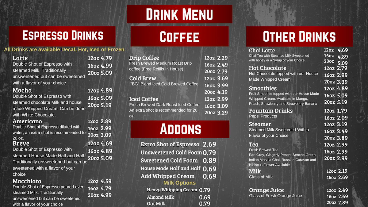 At Broken Grounds Coffee Company Menu, you’ll find a blend of comfort and creativity in every cup and bite. Located at 214 W Jackson St in Millersburg, OH, this cozy spot serves up a variety of expertly crafted coffees, each brewed to perfection. Whether you’re in the mood for a classic drip brew or a specialty espresso drink, there's something here to satisfy every coffee lover's craving.